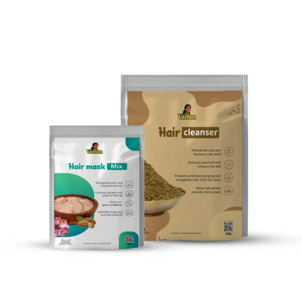 Varam Hair Care Combo is a natural and nourishing hair wellness pack designed to cleanse, strengthen, and revitalize your hair from root to tip. This combo includes Hair Cleanser and Hair Mask Mix, both made with carefully selected herbal ingredients known for promoting scalp health and improving hair texture. Free from harsh chemicals and artificial additives, this combo helps reduce hair fall, control dandruff, and restore natural shine. Suitable for all hair types, it gently cleanses the scalp while deeply conditioning the hair, making it healthier, stronger, and more manageable with regular use.