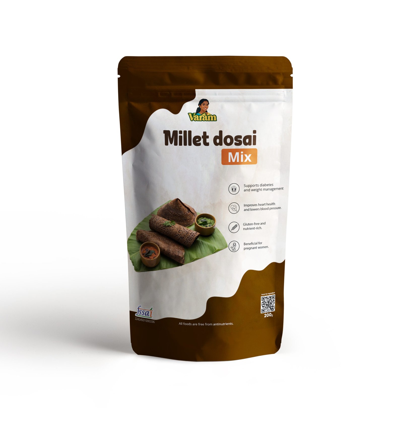 Varam Millet Dosai Mix is a wholesome and nutritious blend made from carefully selected traditional millets and natural ingredients. Rich in dietary fiber, essential minerals, and plant-based nutrients, this mix supports healthy digestion and sustained energy levels. Naturally gluten-free and free from refined flour, it provides a healthy alternative to regular dosa batter. Easy to prepare and gentle on the stomach, Varam Millet Dosai Mix helps you enjoy soft, crispy, and nourishing dosas as part of your daily meals.