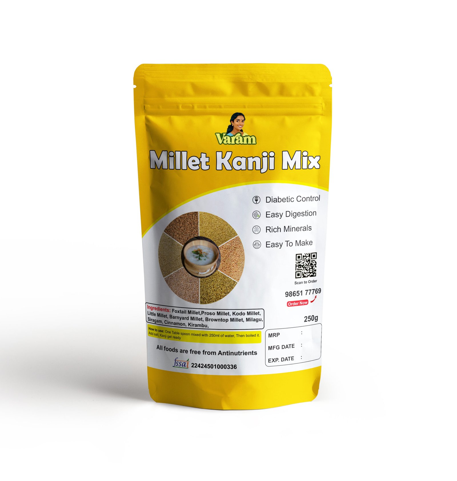 Varam Millet Kanji Mix is a wholesome and nourishing traditional health drink mix made from carefully selected millets and natural ingredients. Rich in fiber, essential minerals, and plant-based nutrients, this mix supports digestion, sustained energy, and overall wellness. Millet-based kanji is known for its easy digestibility and gentle effect on the stomach, making it suitable for children, adults, and seniors. Free from refined flour and artificial additives, it is a healthy daily nutrition option that combines traditional goodness with modern convenience.