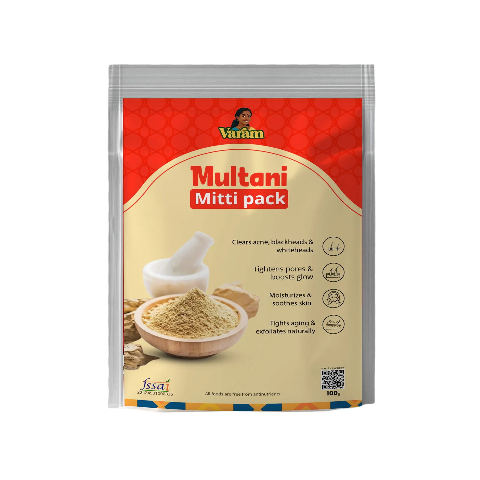 Varam Multani Mitti Pack is a natural clay-based skincare treatment designed to deeply cleanse, purify, and refresh the skin. Made from premium quality Multani Mitti (Fuller’s Earth), this pack helps absorb excess oil, remove impurities, and unclog pores naturally. Known for its cooling and soothing properties, it supports clearer, smoother, and healthier-looking skin. Free from harsh chemicals and artificial additives, it is suitable for regular use and ideal for maintaining natural skin glow.