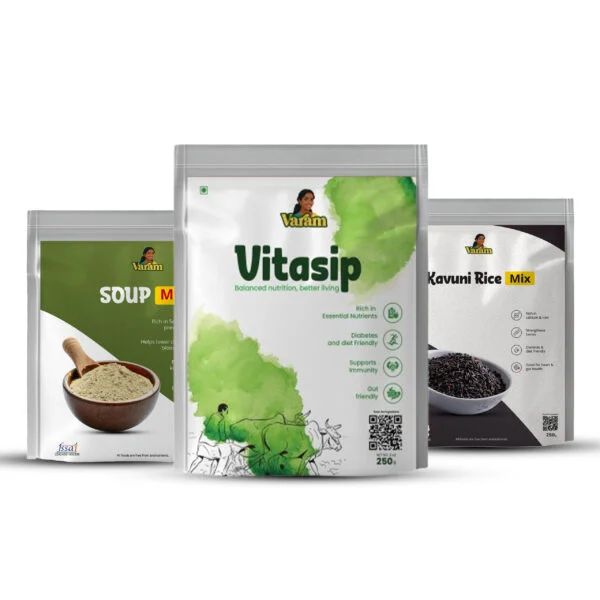 Varam Pregnancy Combo is a thoughtfully formulated nutrition pack designed to support the health and well-being of expecting mothers throughout pregnancy. This combo includes Vitasip Mix, Soup Mix, and Kavuni Rice Mix, each made from wholesome, natural ingredients rich in essential nutrients required during this important stage. Packed with vitamins, minerals, protein, fiber, and antioxidants, it helps support maternal strength, fetal development, improved digestion, and sustained energy. Gentle on the stomach and free from harmful additives, this combo provides balanced nourishment for both mother and baby.
