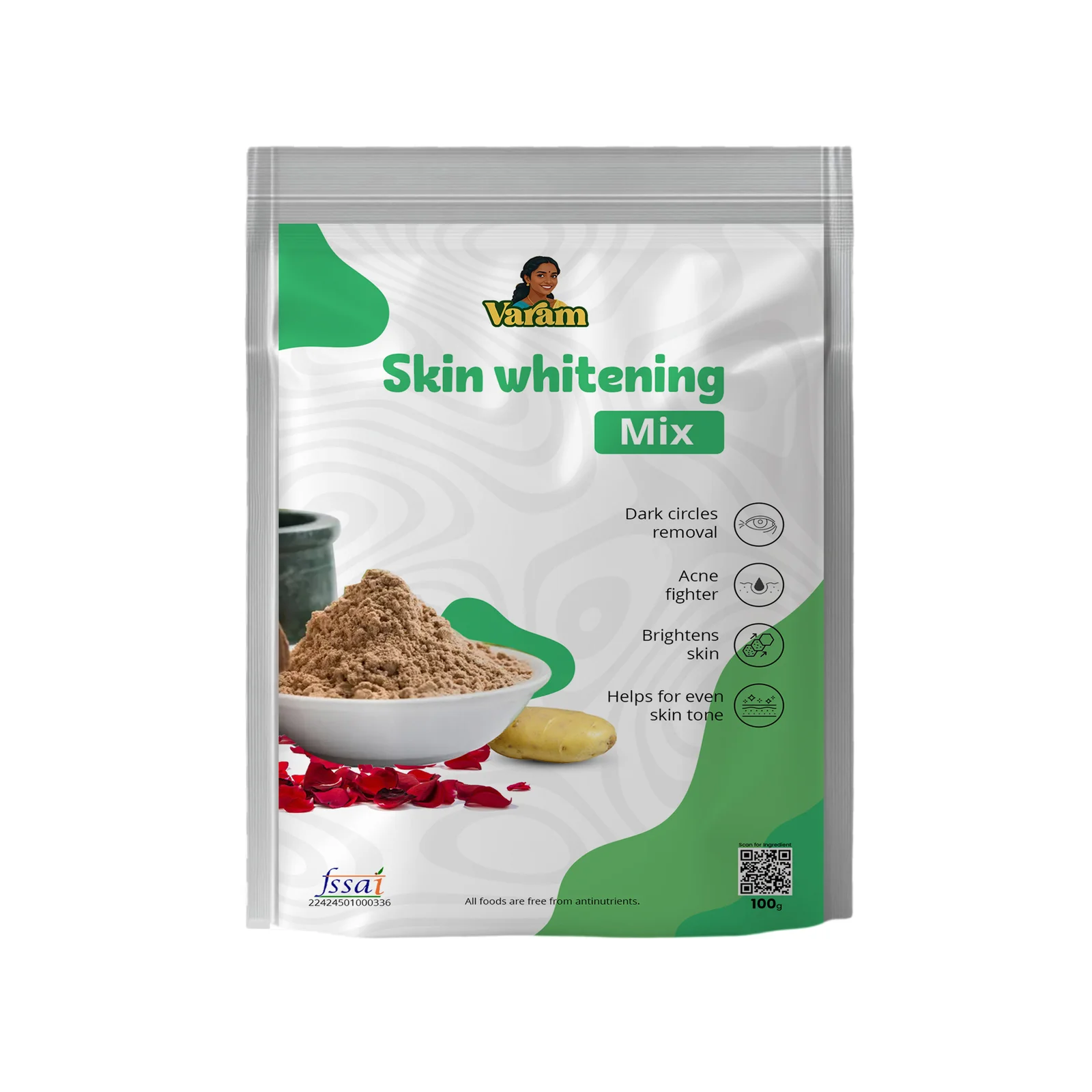 Mix required quantity of Skin Whitening Mix with rose water, milk, or plain water to form a smooth paste. Apply evenly on clean face and neck. Leave for 10–15 minutes and rinse off with lukewarm water. Use 2–3 times a week for best results.