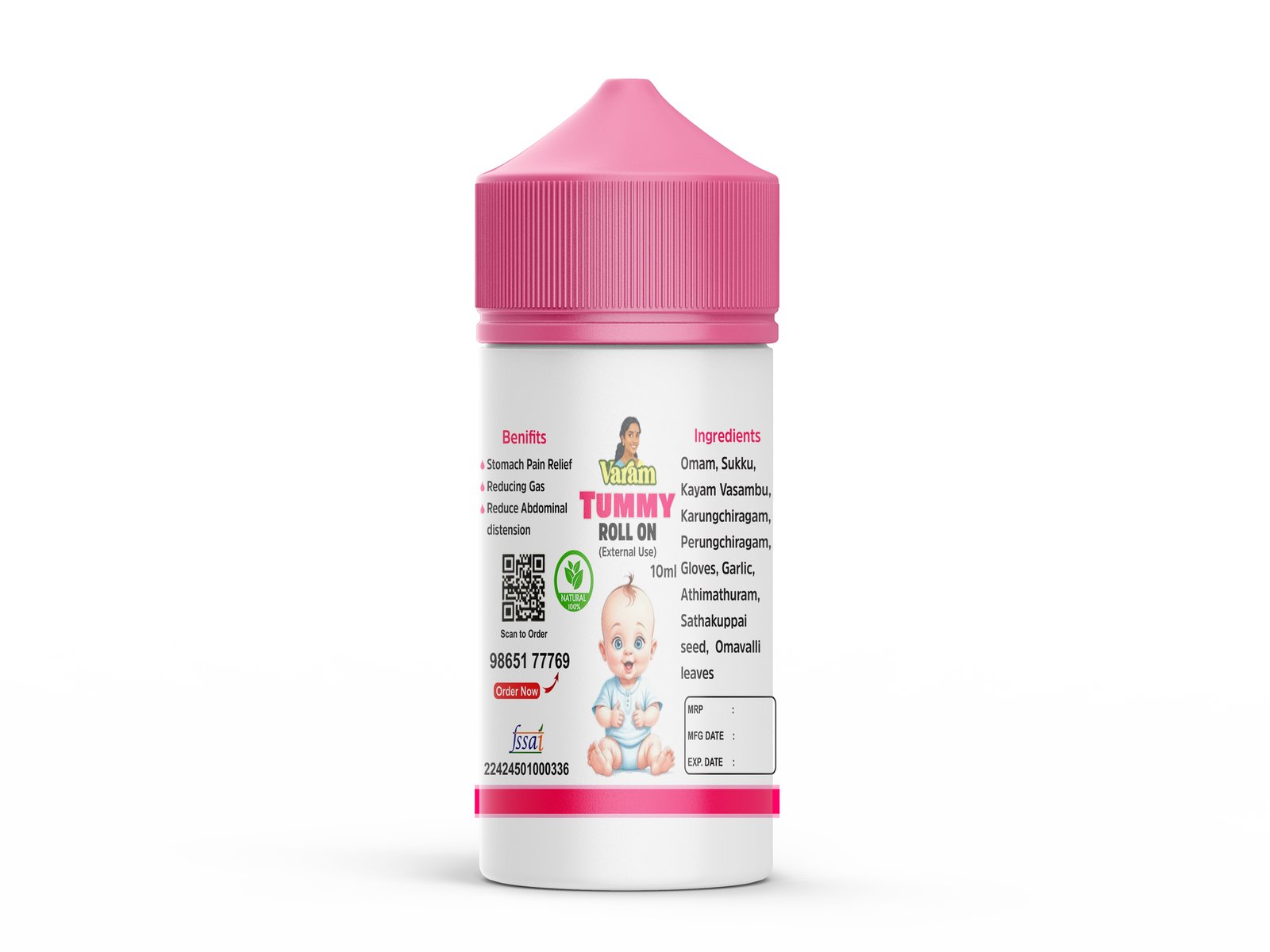 Varam Tummy Roll-On(10ml) is a gentle herbal formulation specially designed to provide soothing relief from stomach discomfort, gas, and bloating. Enriched with natural essential oils known for their calming and digestive-support properties, it helps ease abdominal uneasiness and promotes comfort naturally. The roll-on format ensures easy and mess-free application, making it convenient for both babies and adults. Compact and travel-friendly, it offers quick comfort anytime needed.